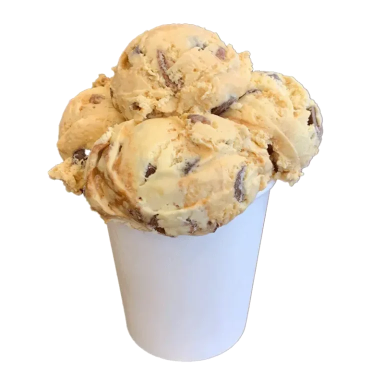 Butter caramel ice cream with chocolate caramel cups, butter roasted pecan pieces, and thick caramel swirls