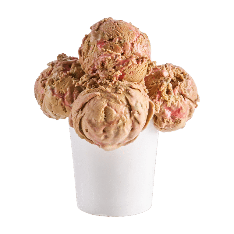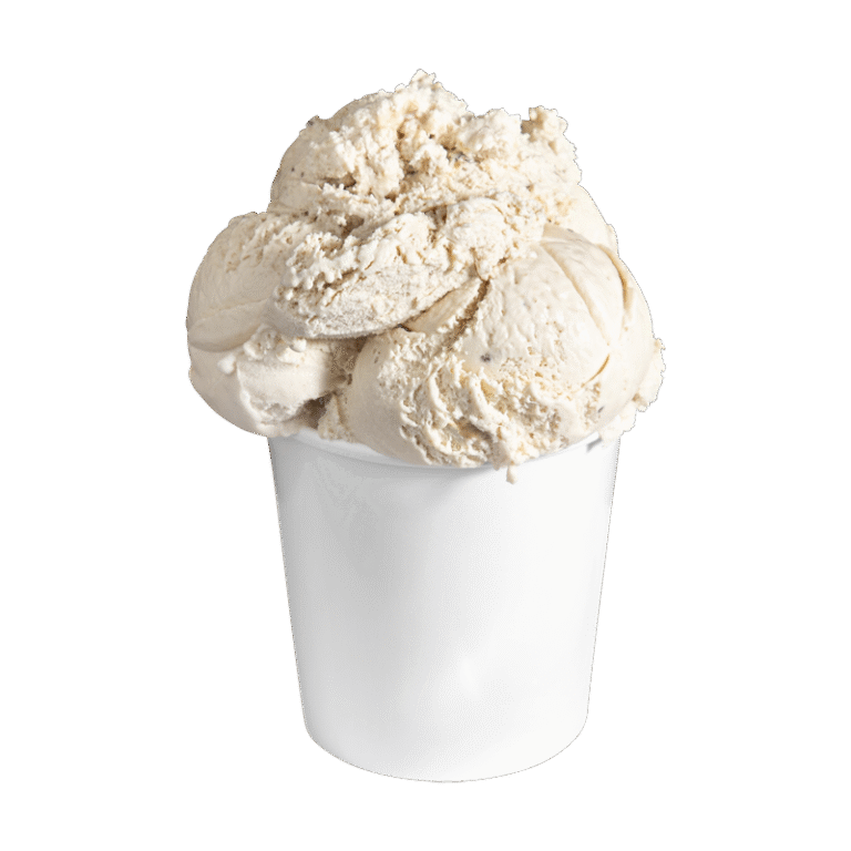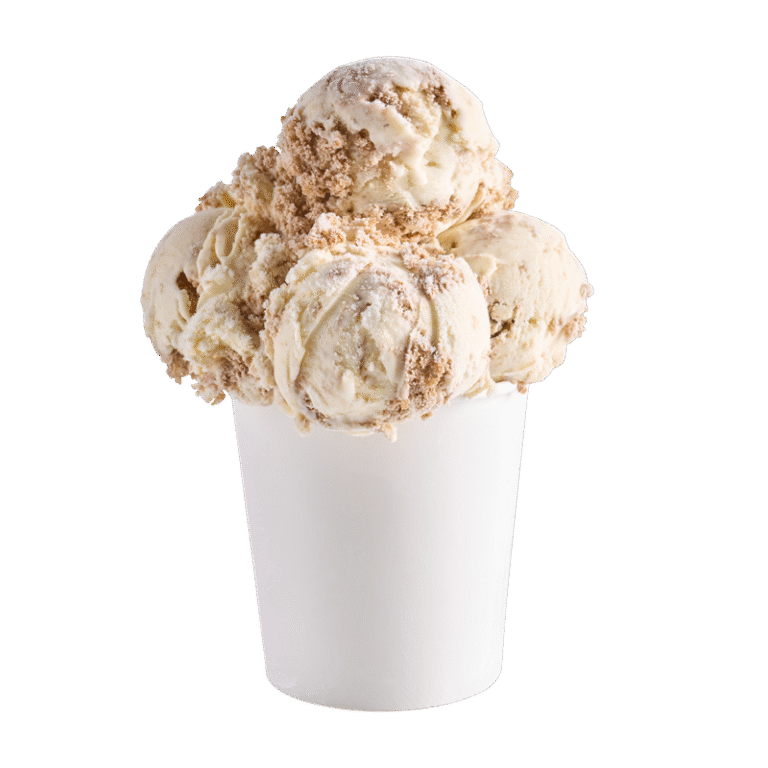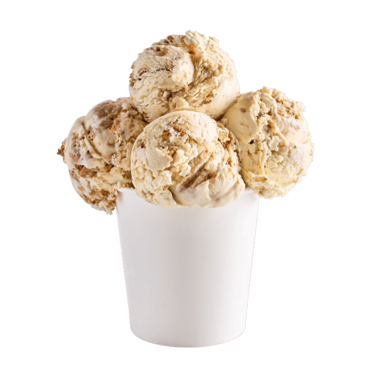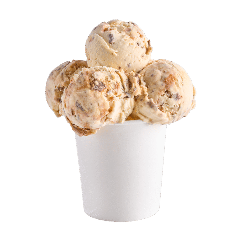 Butter caramel ice cream with chocolate caramel cups, butter roasted pecan pieces, and thick caramel swirls