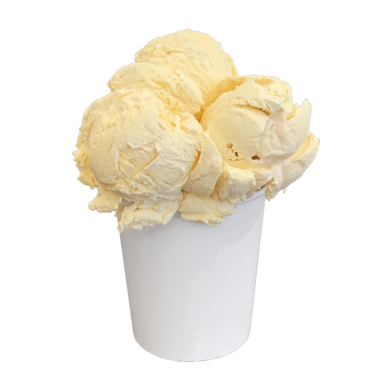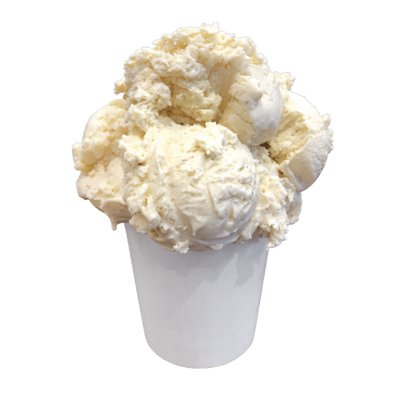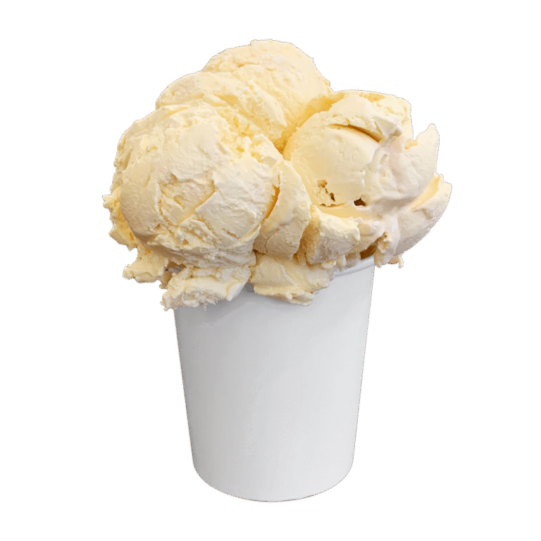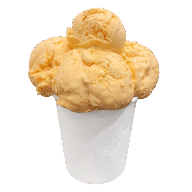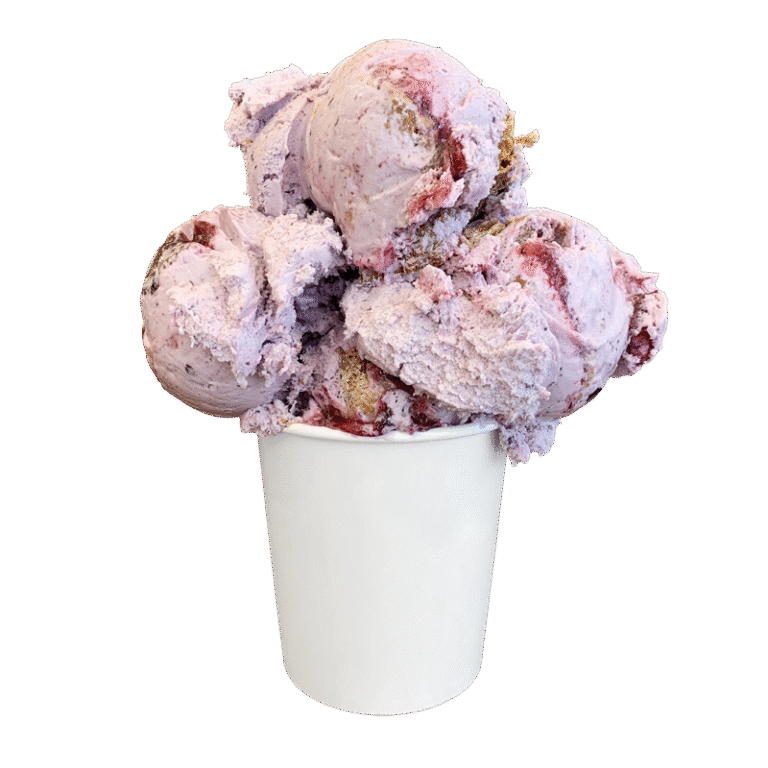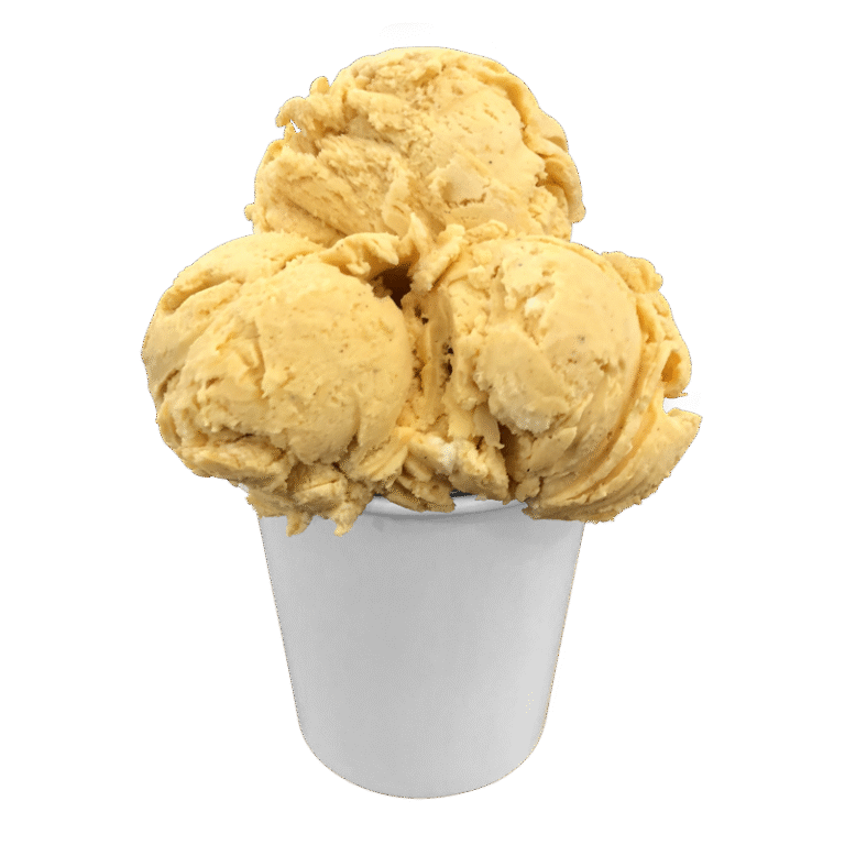 Caramelized banana ice cream with chunks of almond brittle and a white chocolate swirl