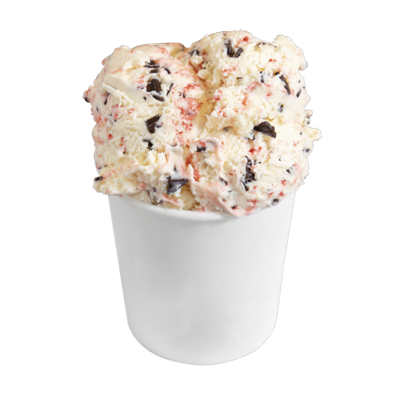 Peppermint ice cream with bits of peppermint candy and dark chocolate flakes